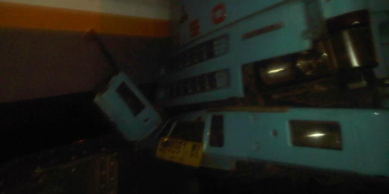 KOMPAS.com/Achmad Faizal Kecelakaan terjadi di Surabaya, Jawa Timur, Rabu (11/6/2014) malam, melibatkan truk Fuso dan Kereta Api Mutiara Timur. Kepala truk terpuntir dan menghantam gerbong kereta setelah hampir separuh badan truk tertabrak kereta ini di perlintasan tersebut.